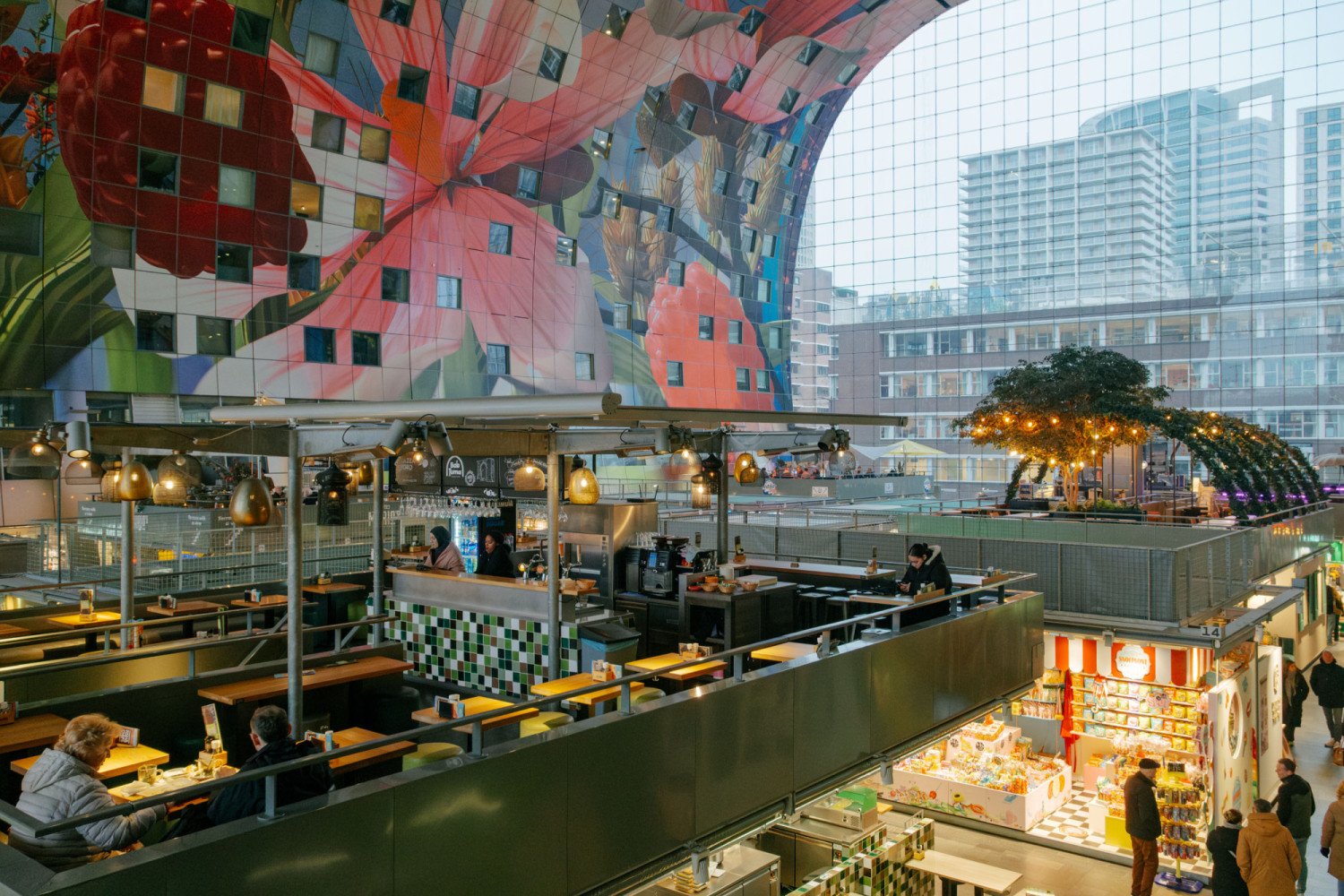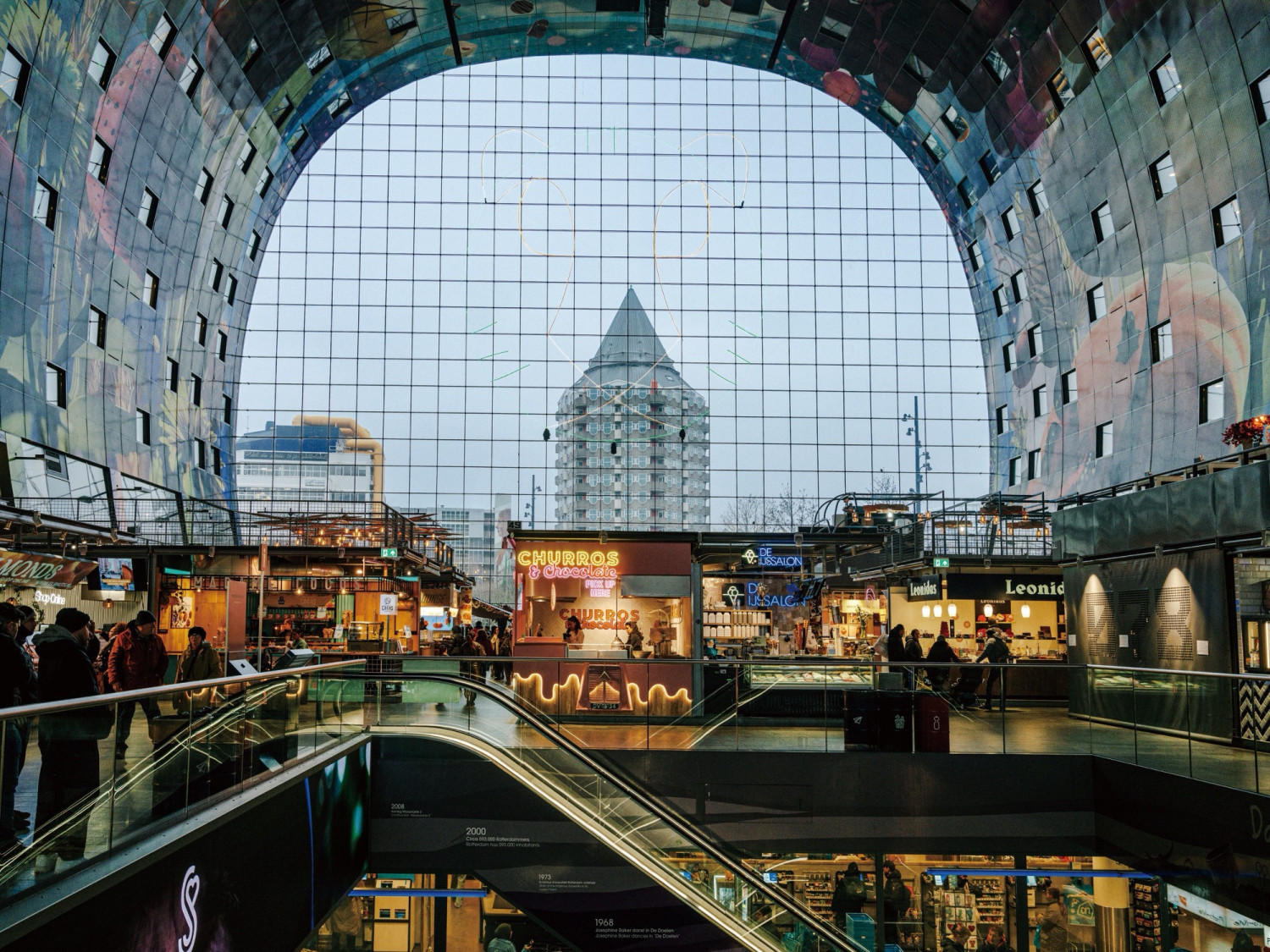 Those who travel to Rotterdam are leaving behind cities that are defined by their fixed landscapes and entering one that is still in the process of taking shape. Start your journey at Rotterdam Central Station, where its asymmetrical roof overhangs a plaza that connects to multiple streets heading in all directions, and head toward the Markthal (Market Hall). Pass under this structure’s massive arch and find a panoply of kiosks selling cheese, fruit, flowers and fish beneath the colorful murals splashed across the ceiling above. When you step out of the building, having a fresh herring sandwich, naturally, the sheer scope of the building comes into view, with its residential spaces above the market. It’s the moment you realize that the simple acts of eating, shopping and sleeping are experiments that keep this city running.