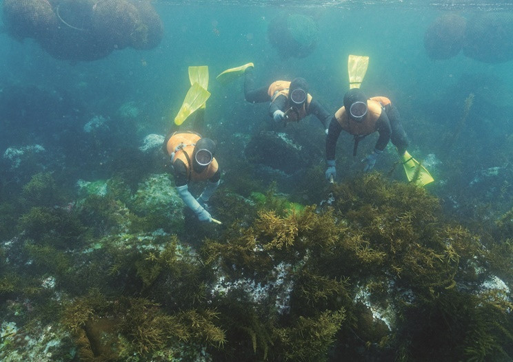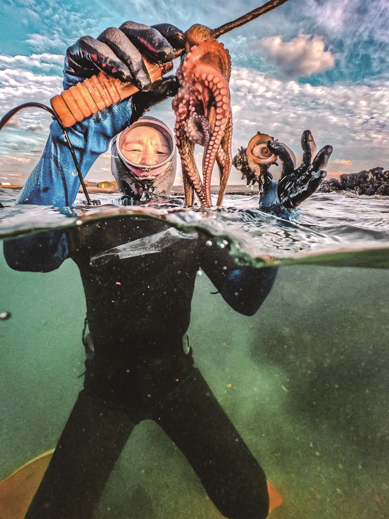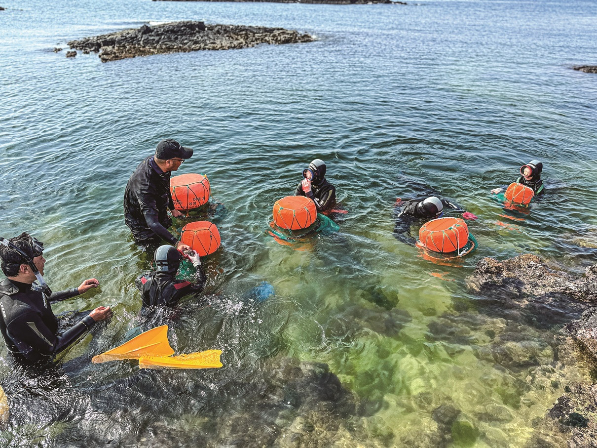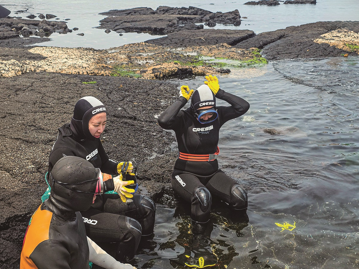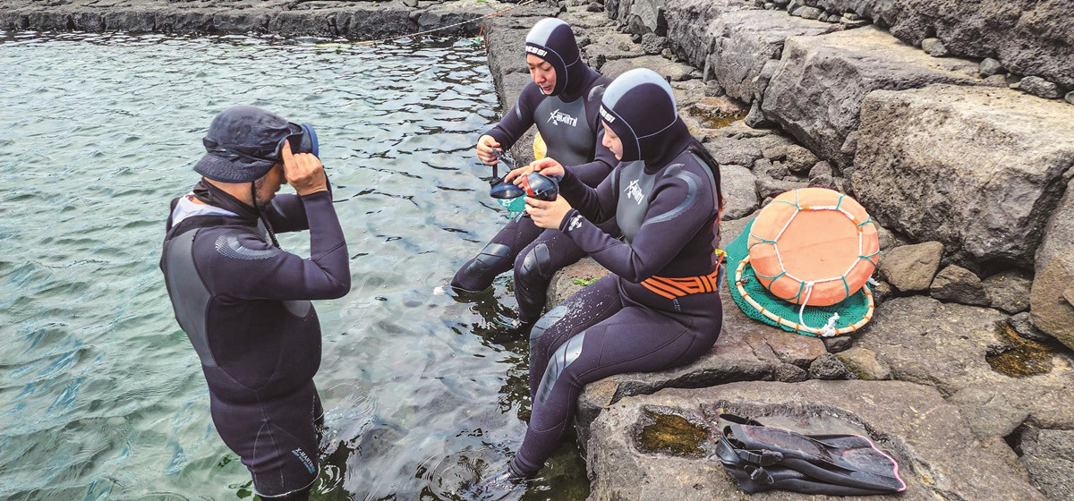 of the haenyeo lifestyle should consider the Gimnyeong haenyeo training program operated by the Jeju Tourism Organization. Led by veteran haenyeo known as samchun, who have spent a lifetime diving in Jeju’s waters, the program teaches the fundamentals of diving, including how to regulate your breath and use the necessary gear. The three-day program, which includes accommodations for two nights, is designed to be accessible for complete novices. You’re gradually eased into the haenyeo routine, learning the bareutjabi technique of gathering conches, clams and crabs by hand and diving down alongside veteran divers to harvest seafood. There are also opportunities to clean and cook the catch, pray for the well-being of your family and the ocean, and go on seaside walks to hear tales about the village of Gimnyeong-ri.