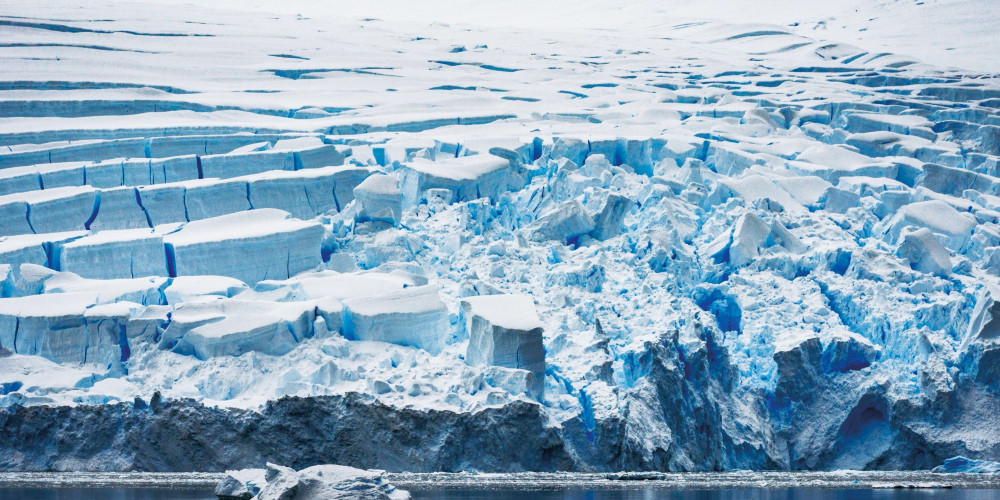 The glacier rises as a vast wall between sea and sky. Beneath its shrouded whiteness, blue crystals unfurl like a silent symphony, dissolving the boundaries of time and space. What calls for our care is the enduring future it carries within.