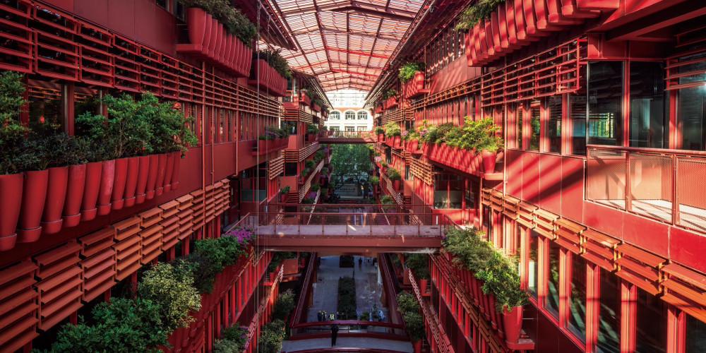 The Roof is a single complex made up of four interconnected wings. The covered central passageway connects to various interior spaces and also links to a subterranean plaza, designed to be able to host small-scale events. A new type of alleyway that intentionally blurs urban boundaries, The Roof invites people to linger and experience the space in a multitude of ways. Through this ambiguous sense of space, Nouvel is proposing a novel approach for architecture and the city to meet. To make this space even more dynamic, Nouvel integrated into the exterior walls and arcade spaces some 2,500 flowerpots that transform the building into a living, breathing entity.