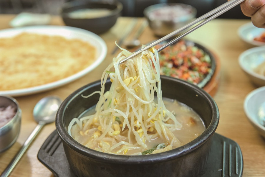 아무려나 콩나물 운운하며 콩나물국을 빼놓을 순 없다. 그냥 콩나물을 바탕으로 국 잘 끓이면 그뿐이다. 오로지 소금 간만 한 맑은 콩나물국 또는 간신히 고춧가루만 살짝 흩은 콩나물국 한 사발을 뜨거운 채로 들이켜며 “어, 시원하다!” 외치는 감각은 통번역 가능할까? 한국어 용언 ‘시원하다’는 물리적으로는 이완(弛緩), 진경(鎭痙), 진정(鎭靜)을 아우르는 말이다. 그야말로 내장의 긴장이 풀어지며 속이 후련해진다는 뜻이다. 몸이 풀리며 개운해지는 느낌까지 깃든 말이다. 한식 국탕 가운데 가장 간단한 방식이라고 할 만한 콩나물국은 한국인이 언제 어디서든 훌훌 마실 수 있는 가장 시원한 국탕이다. 은은한 콩 향 위로 맑은 수분감이 번지고 씹을수록 담백함이 진해지는 맛은, 화려하진 않지만 진득히 입안에 스미는 매력이 있다.