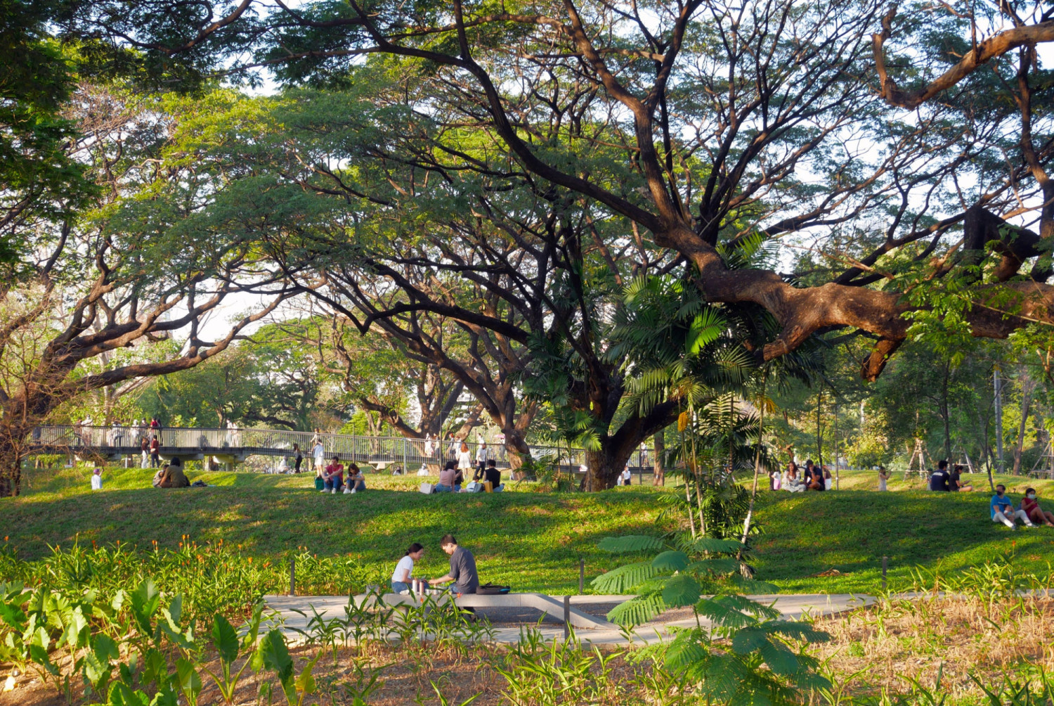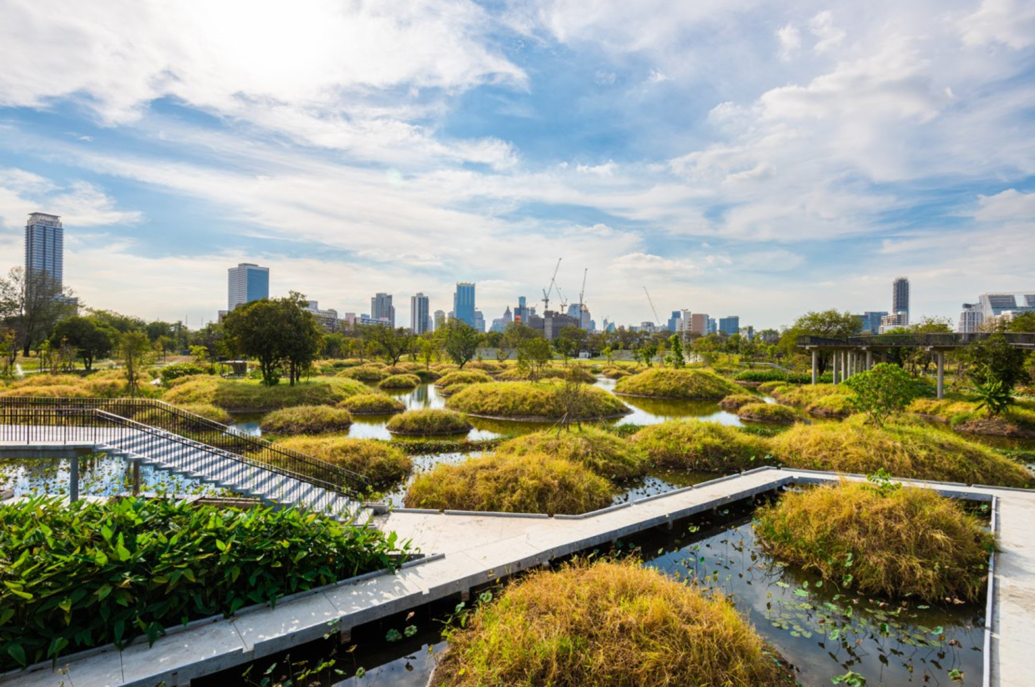 방콕은 해발 평균 약 1.5m에 불과한 저지대 도시다. 몬순기후의 영향으로 연간 약 1500mm의 비가 내리고, 지하수 사용으로 지반이 내려앉으며 침수 위험은 점점 커졌다. 기존의 배수 방식만으로는 침수로부터 도시를 지키는 데에는 한계가 있었다. 이런 조건 속에서 부지를 어떻게 바꿀 것인가는 도시의 생존과 연결된 문제였다. 콩젠 위가 이끄는 중국의 조경 설계 사무소 투렌스케이프와 태국의 아르솜실프 랜드스케이프 스튜디오가 함께 참여했다. 이들은 더 짓기보다는 비워두고 기존의 것을 활용하는 방식을 선택했다. 산업 부지는 자연으로 되돌아갔고, 이곳은 시리킷 왕비를 기념하는 공원이자 방콕이 미래의 균형을 모색하는 장소로 바뀌었다.