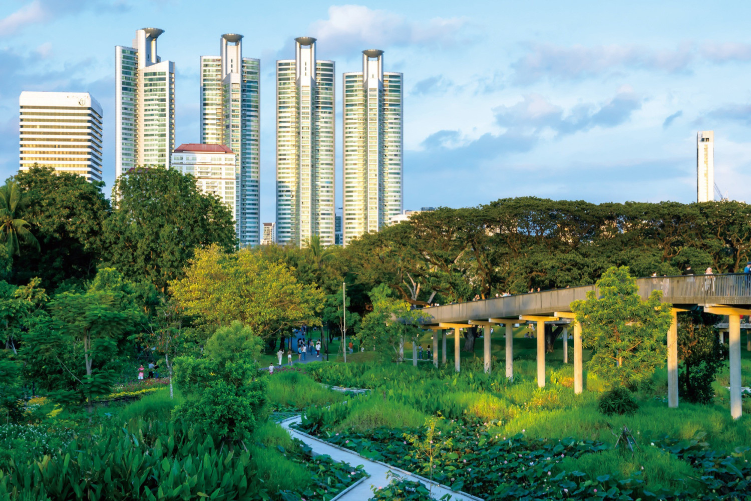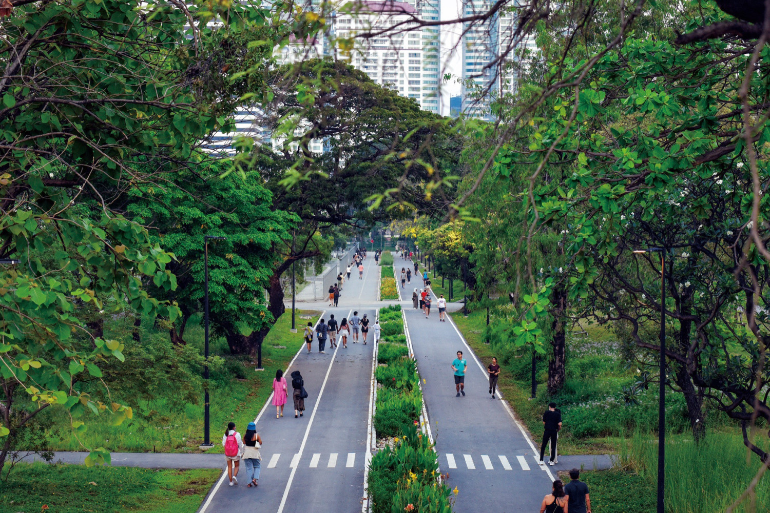 벤짜끼띠 포레스트 파크의 핵심은 형태보다 작동 방식에 있다. 이 공원은 ‘스펀지 시티’라는 개념을 바탕으로 빗물을 빠르게 흘려 보내는 대신 땅이 스스로 흡수하고 저장하도록 설계됐다. 폭우가 내리면 물을 받아들이고 천천히 스며들게 하며, 그 과정에서 도시 전체가 감당해야 할 부담을 덜어준다. 또한 저장된 물로 오염을 정화하며, 다양한 생물이 머무를 수 있는 환경을 만들어낸다. 눈에 잘 보이지는 않지만, 도시를 유지하는 중요한 기반이 이 안에 형성돼 있는 것이다.