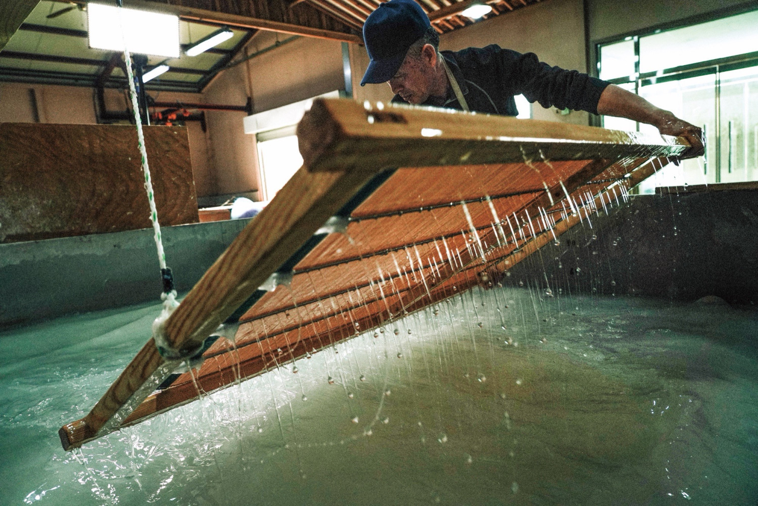 한지의 독보적인 강인함은 우리만의 독창적인 제작 방식에서 기원한다. 그 첫 번째 비밀은 ‘고해(叩解)’에 있다. 닥섬유를 무수히 두드려 잘게 나누는 이 과정은 종이의 밀도와 질감을 결정짓는 수행(修行)의 시간이다. 두드림을 통해 섬유가 치밀해질수록 종이는 더욱 질기고 단단해진다. 이 같은 정성의 시간을 견뎌낸 섬유는 비로소 장인의 손 위에서 형체를 얻을 준비를 마친다. 두 번째 비밀은 ‘외발뜨기(흘림뜨기)’라는 독창적인 초지(抄紙) 기법이다. 양지(洋紙)가 한 방향으로 물을 진동시켜 균일하게 생산되는 것과 달리, 외발뜨기는 사각의 대발 위에 물을 앞뒤 좌우로 세차게 흘려 보내며 섬유를 90°로 교차시킨다.